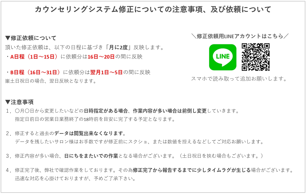 プレカン、プレゼン内容を選択するサロンスタッフ専用の一覧画面です。このページは、お客様にお見せせず、下記内容を選び(可能ならお客様のお名前や担当者を選択)タブレットをお渡しご依頼下さい。